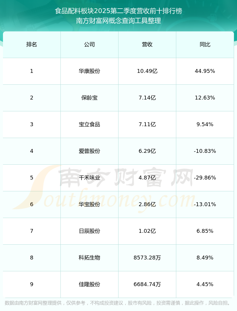 按照南方財(cái)富網(wǎng)概念查詢(xún)工具統(tǒng)計(jì),該股所屬板塊為食品配料板塊,該板塊共有9只股票,愛(ài)普股份2025第二季度營(yíng)收在該板塊中排名為第4名,該板塊2025第二季度營(yíng)收排名前十的股票如下表:
