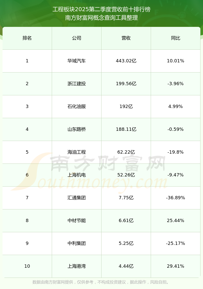 按照南方財(cái)富網(wǎng)概念查詢工具統(tǒng)計(jì),該股所屬板塊為工程板塊,該板塊共有12只股票,東方電氣2025第二季度營(yíng)收在該板塊中排名為第12名,該板塊2025第二季度營(yíng)收排名前十的股票如下表: