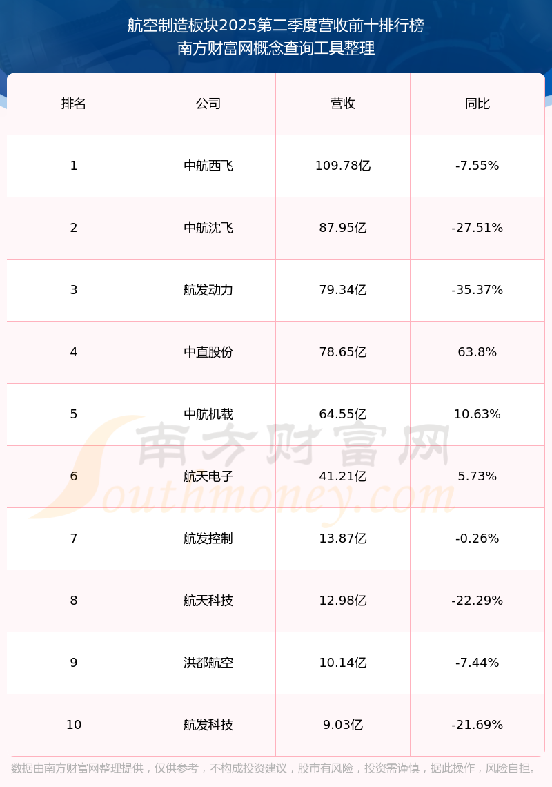 按照南方財富網(wǎng)概念查詢工具統(tǒng)計,該股所屬板塊為航空制造板塊,該板塊共有16只股票,中直股份2025第二季度營收在該板塊中排名為第4名,該板塊2025第二季度營收排名前十的股票如下表: