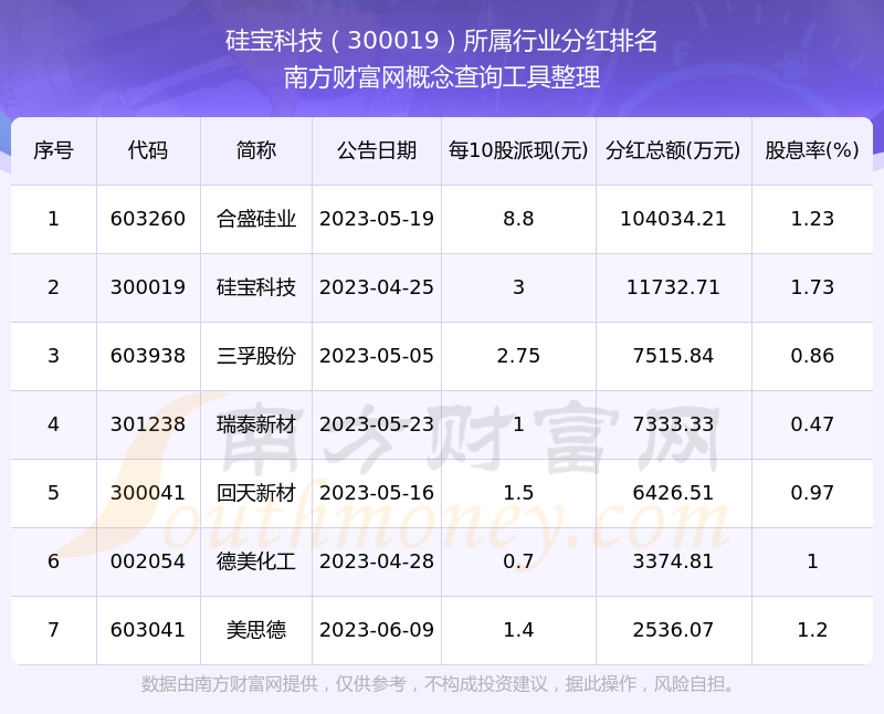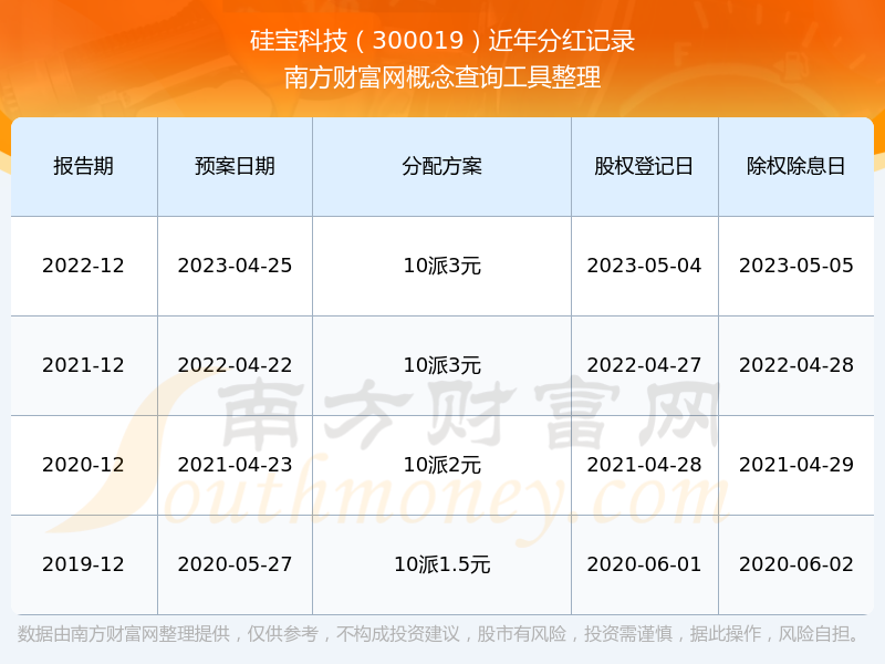 硅寶科技最新一次公布的分紅方案為10派3元。本次權益分派股權登記日為2023年5月4日,除權除息日為2023年5月5日,派息日為2023年5月5日。