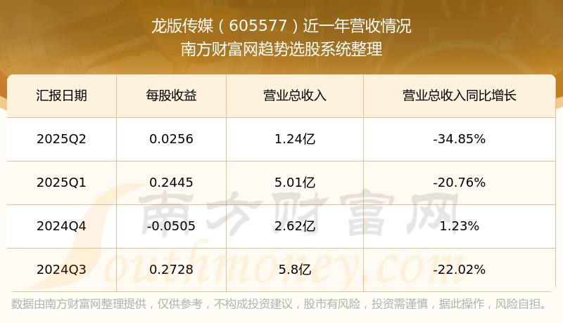 龍版?zhèn)髅?605577)披露2025年第二季度報告,報告期實現(xiàn)營收1.24億元,同比-34.85%;歸母凈利潤1135.74萬元,同比137.06%;扣非凈利潤-3517.78萬元,同比1.59%。