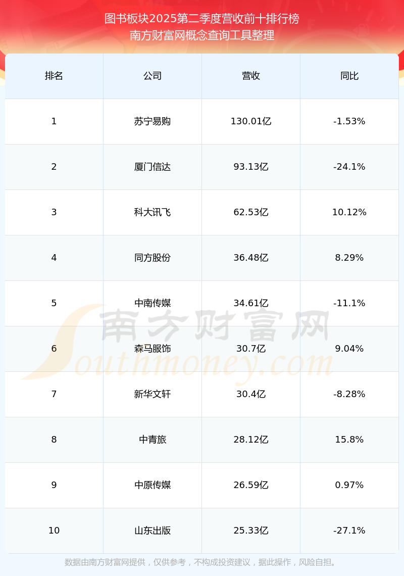 按照南方財富網(wǎng)概念查詢工具統(tǒng)計,該股所屬板塊為圖書板塊,該板塊共有62只股票,龍版?zhèn)髅?025第二季度營收在該板塊中排名為第53名,該板塊2025第二季度營收排名前十的股票如下表:
