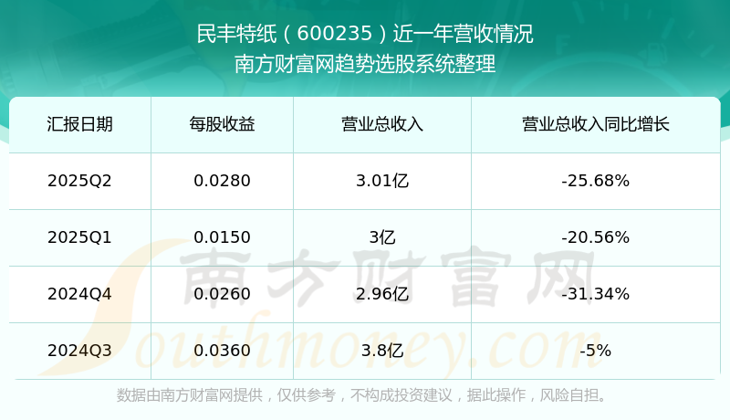A股上市公司民豐特紙(代碼:600235)發(fā)布2025年第二季度財(cái)報(bào),公司2025年第二季度歸屬于上市公司股東的凈利潤(rùn)為997.15萬(wàn)元,凈利潤(rùn)同比增長(zhǎng)-37.66%,環(huán)比增長(zhǎng)95.44%。