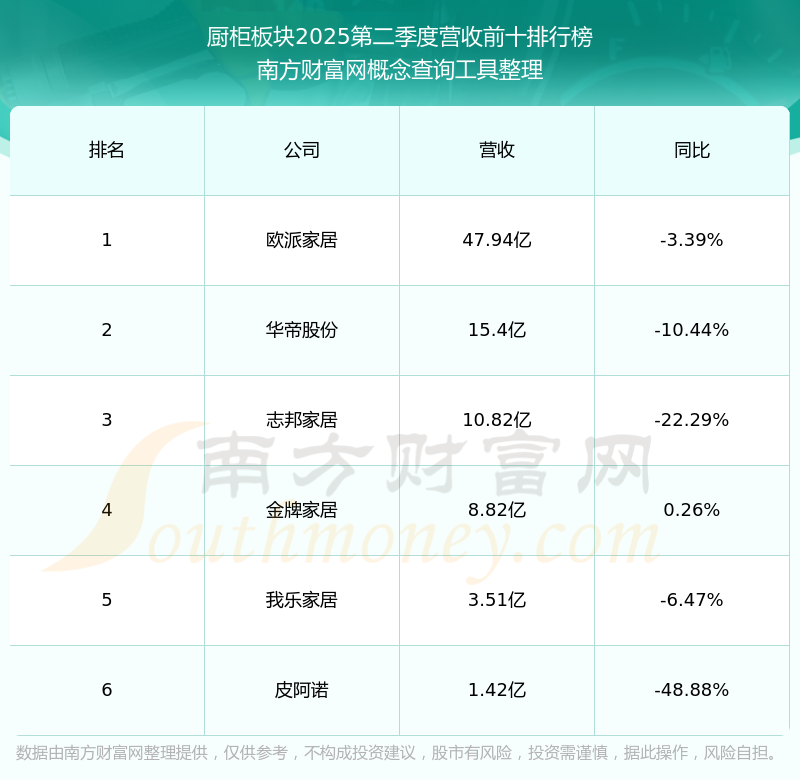 按照南方財(cái)富網(wǎng)概念查詢工具統(tǒng)計(jì),該股所屬板塊為廚柜板塊,該板塊共有6只股票,金牌家居2025第二季度營收在該板塊中排名為第4名,該板塊2025第二季度營收排名前十的股票如下表: