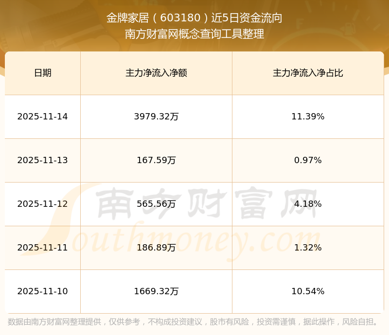 二、金牌家居(603180)近期盤面、資金面情況