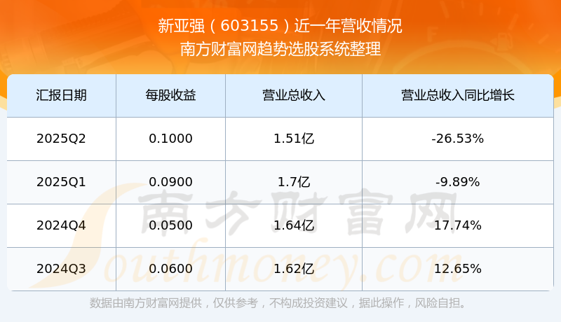 新亞強(qiáng)2025年第二季度財(cái)報(bào)顯示,公司主營(yíng)收入1.51億元,同比-26.53%;歸母凈利潤(rùn)2816.61萬元,同比-41.82%;扣非凈利潤(rùn)2058.65萬元,同比-49.31%;