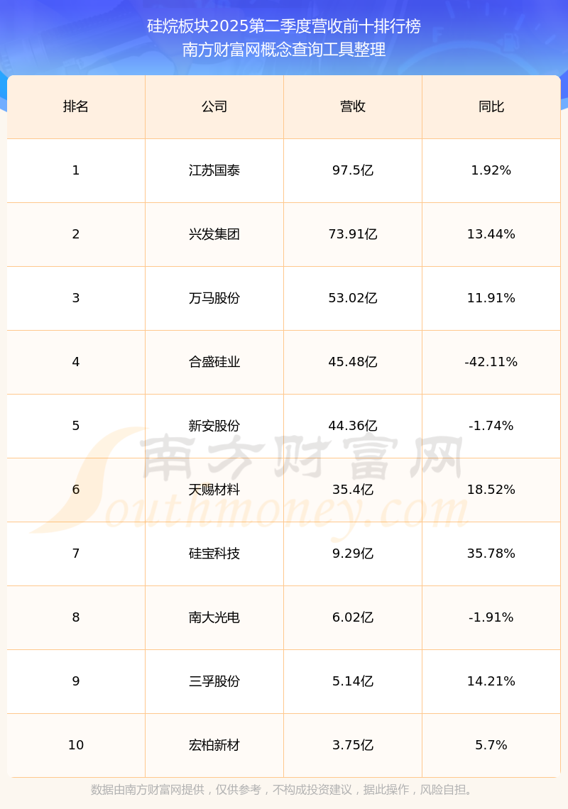按照南方財(cái)富網(wǎng)概念查詢工具統(tǒng)計(jì),該股所屬板塊為硅烷板塊,該板塊共有13只股票,新亞強(qiáng)2025第二季度營(yíng)收在該板塊中排名為第13名,該板塊2025第二季度營(yíng)收排名前十的股票如下表: