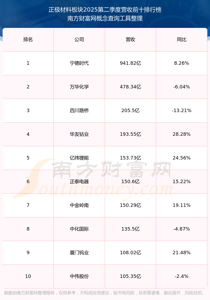 按照南方財(cái)富網(wǎng)概念查詢工具統(tǒng)計(jì),該股所屬板塊為正極材料板塊,該板塊共有95只股票,振華新材2025第二季度營收在該板塊中排名為第74名,該板塊2025第二季度營收排名前十的股票如下表: