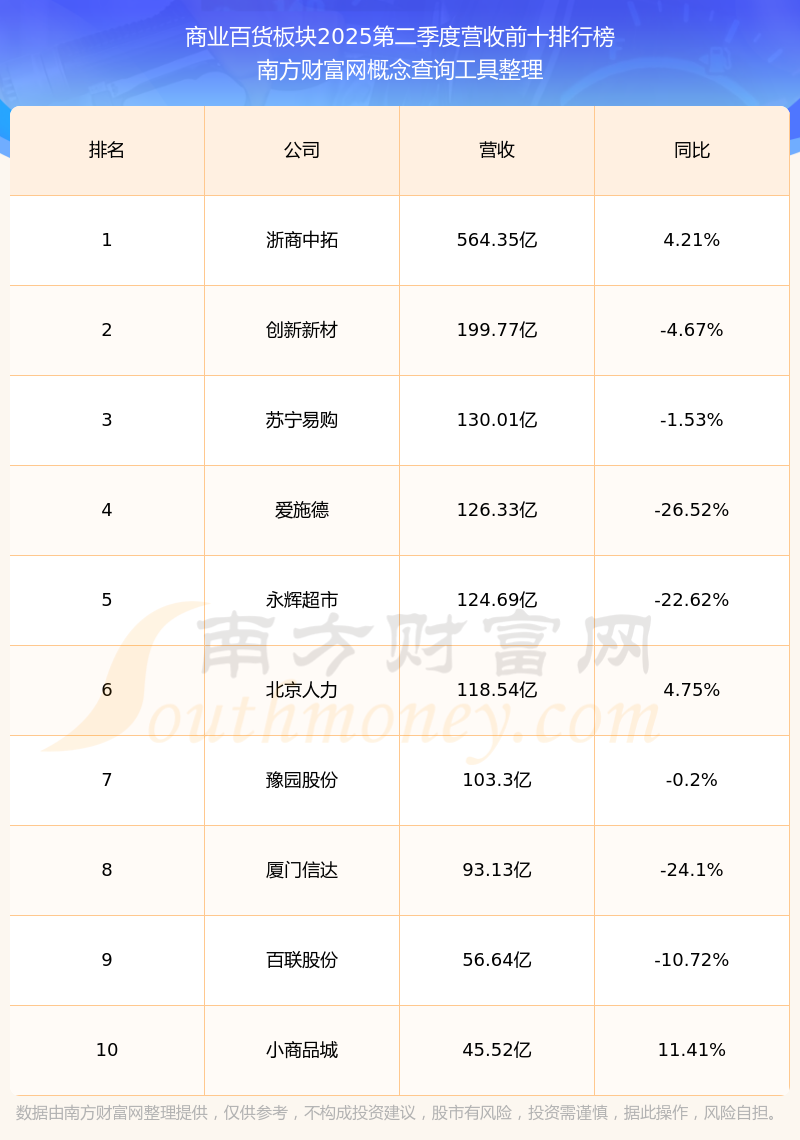 按照南方財(cái)富網(wǎng)概念查詢工具統(tǒng)計(jì),該股所屬板塊為商業(yè)百貨板塊,該板塊共有75只股票,大商股份2025第二季度營(yíng)收在該板塊中排名為第24名,該板塊2025第二季度營(yíng)收排名前十的股票如下表: