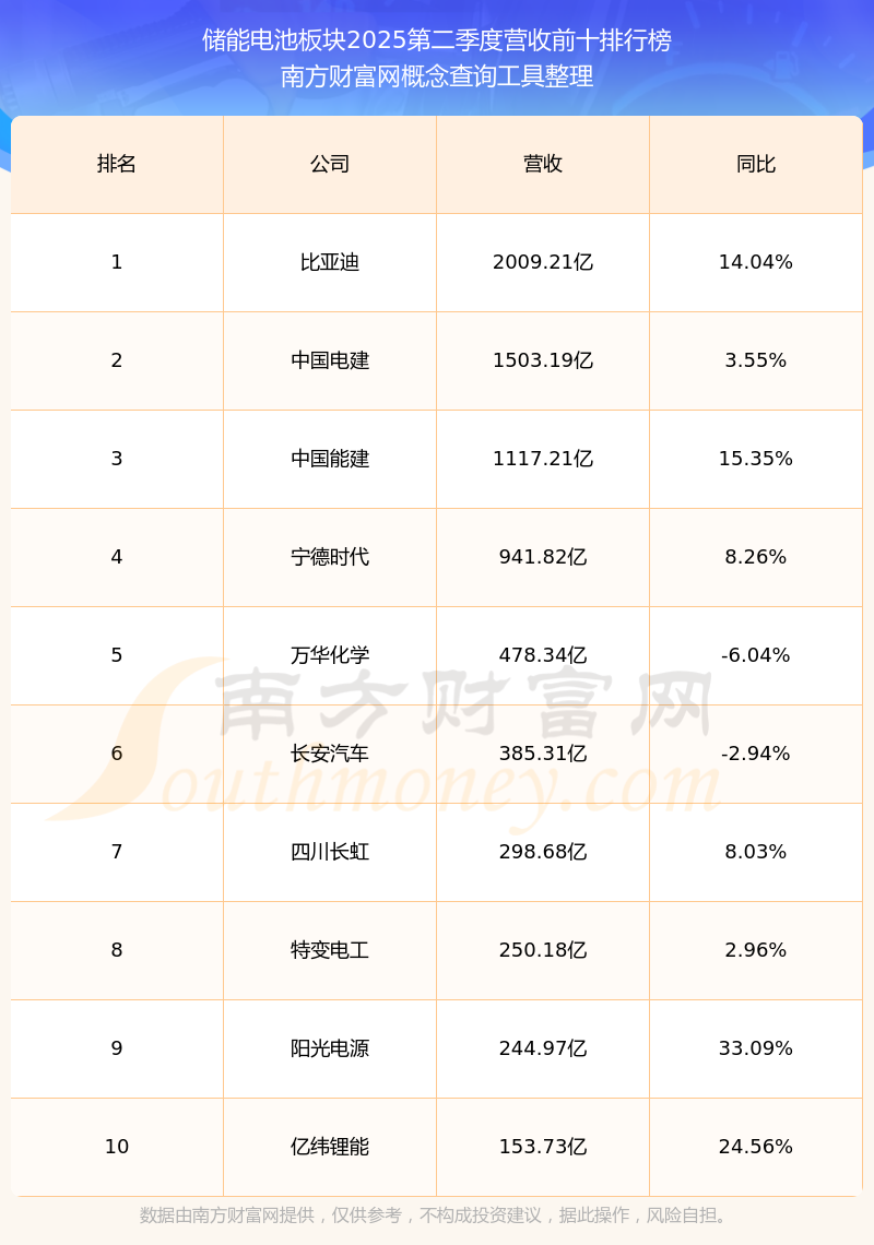 按照南方財(cái)富網(wǎng)概念查詢工具統(tǒng)計(jì),該股所屬板塊為儲(chǔ)能電池板塊,該板塊共有104只股票,艾羅能源2025第二季度營(yíng)收在該板塊中排名為第64名,該板塊2025第二季度營(yíng)收排名前十的股票如下表: