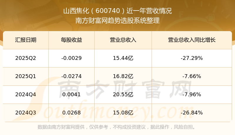山西焦化2025年第二季度顯示,公司主營(yíng)收入15.44億元,同比-27.29%;歸母凈利潤(rùn)-735.2萬元,同比-106.22%;扣非凈利潤(rùn)-1023.36萬元,同比-109.18%。