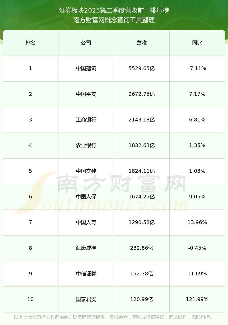 按照南方財(cái)富網(wǎng)概念查詢工具統(tǒng)計(jì),該股所屬板塊為證券板塊,該板塊共有65只股票,華鑫股份2025第二季度營收在該板塊中排名為第54名,該板塊2025第二季度營收排名前十的股票如下表: