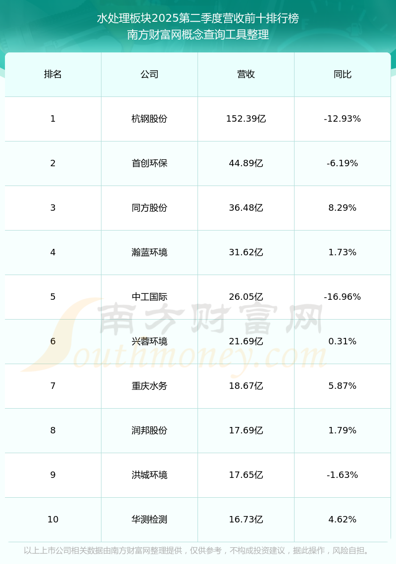 按照南方財富網(wǎng)概念查詢工具統(tǒng)計,該股所屬板塊為水處理板塊,該板塊共有63只股票,金科環(huán)境2025第二季度營收在該板塊中排名為第50名,該板塊2025第二季度營收排名前十的股票如下表: