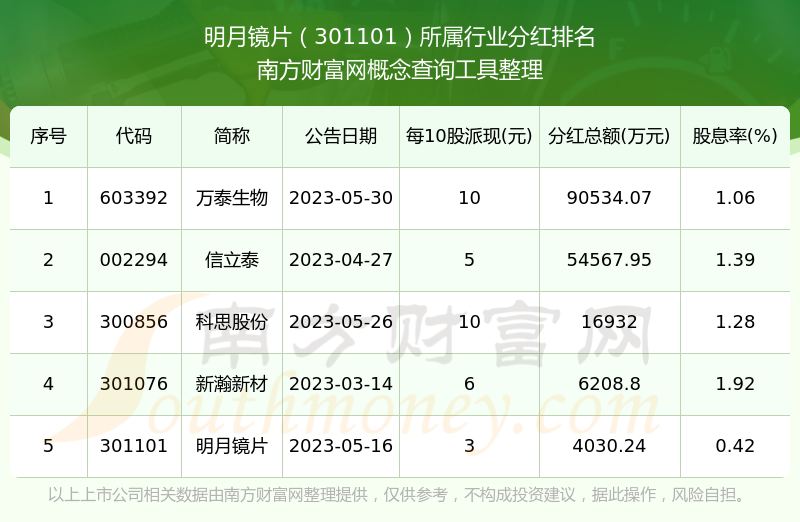 按照南方財(cái)富網(wǎng)趨勢(shì)選股系統(tǒng)統(tǒng)計(jì),明月鏡片所屬行業(yè)為鏡片行業(yè),鏡片行業(yè)分紅排名情況如下表: