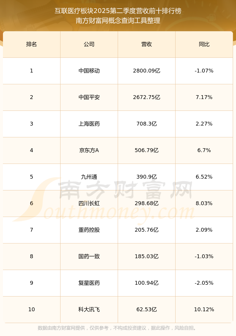 按照南方財富網(wǎng)概念查詢工具統(tǒng)計,該股所屬板塊為互聯(lián)醫(yī)療板塊,該板塊共有127只股票,上海醫(yī)藥2025第二季度營收在該板塊中排名為第3名,該板塊2025第二季度營收排名前十的股票如下表:
