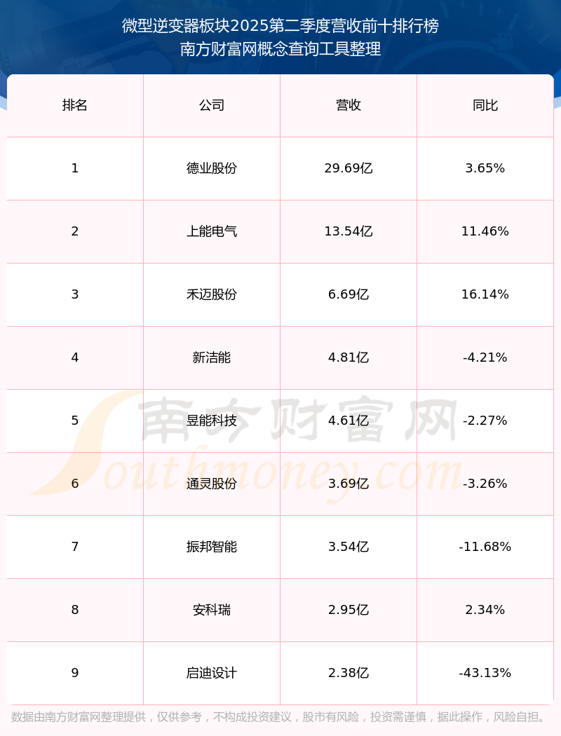 按照南方財(cái)富網(wǎng)概念查詢工具統(tǒng)計(jì),該股所屬板塊為微型逆變器板塊,該板塊共有9只股票,禾邁股份2025第二季度營(yíng)收在該板塊中排名為第3名,該板塊2025第二季度營(yíng)收排名前十的股票如下表: