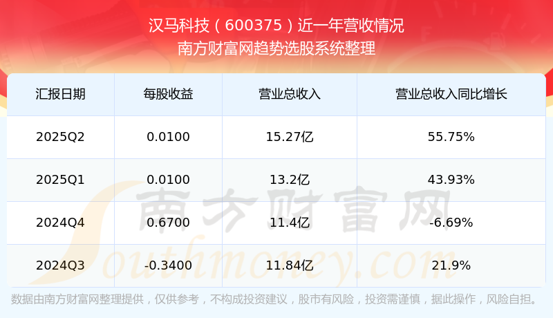 漢馬科技(600375)披露2025年第二季度報告,報告期實現(xiàn)營收15.27億元,同比55.75%;歸母凈利潤1596.9萬元,同比118.39%;扣非凈利潤-1923.52萬元,同比82.68%;基本每股收益0.01元。