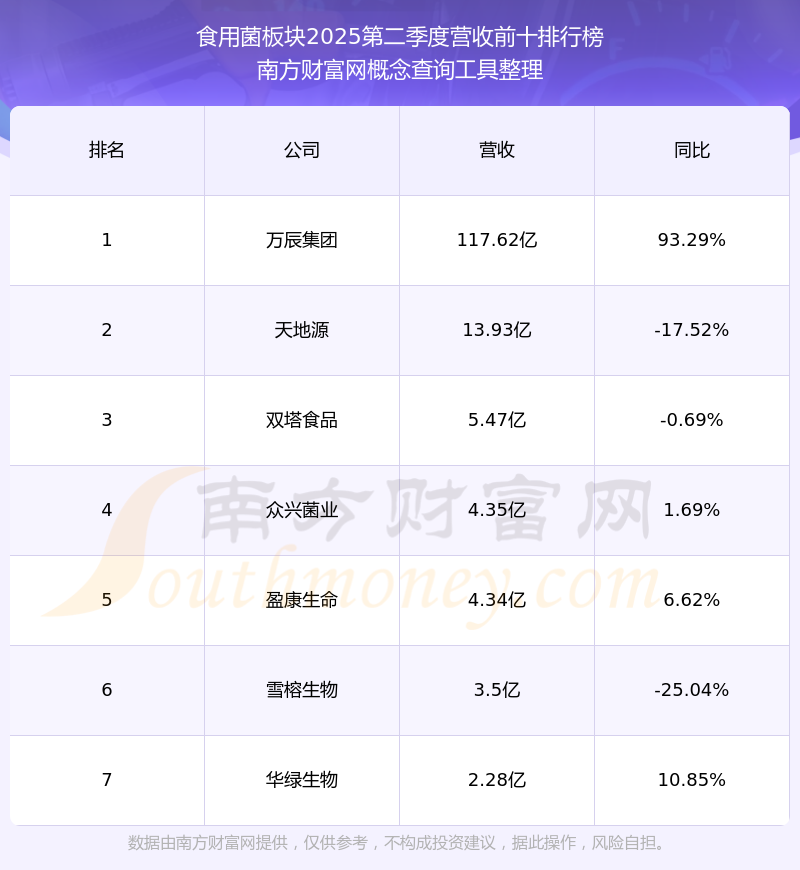 按照南方財(cái)富網(wǎng)概念查詢工具統(tǒng)計(jì),該股所屬板塊為食用菌板塊,該板塊共有7只股票,博聞科技2025第二季度營收在該板塊中排名為第7名,該板塊2025第二季度營收排名前十的股票如下表: