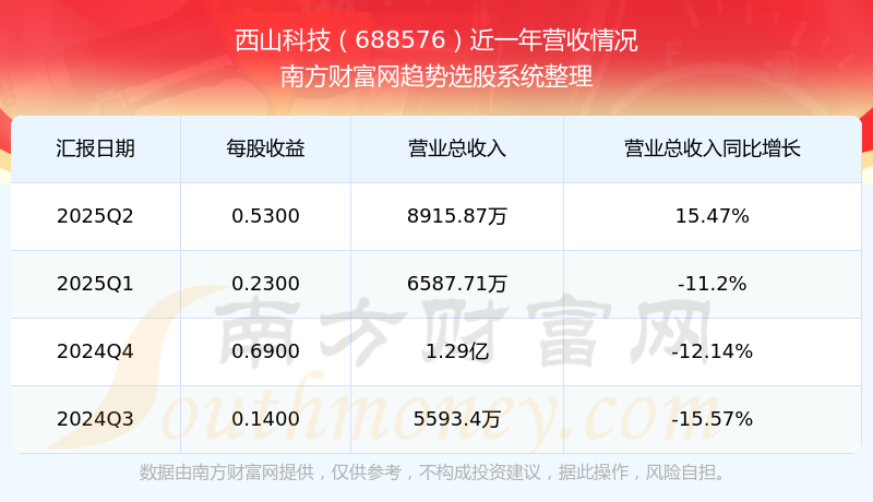財(cái)報(bào)顯示,2025年第二季度西山科技營(yíng)收8915.87萬(wàn)元,同比增長(zhǎng)15.47%,凈利潤(rùn)2290.52萬(wàn)元,同比增長(zhǎng)-30.62%。