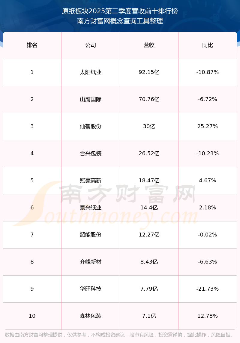 按照南方財富網(wǎng)概念查詢工具統(tǒng)計,該股所屬板塊為原紙板塊,該板塊共有18只股票,榮晟環(huán)保2025第二季度營收在該板塊中排名為第15名,該板塊2025第二季度營收排名前十的股票如下表: