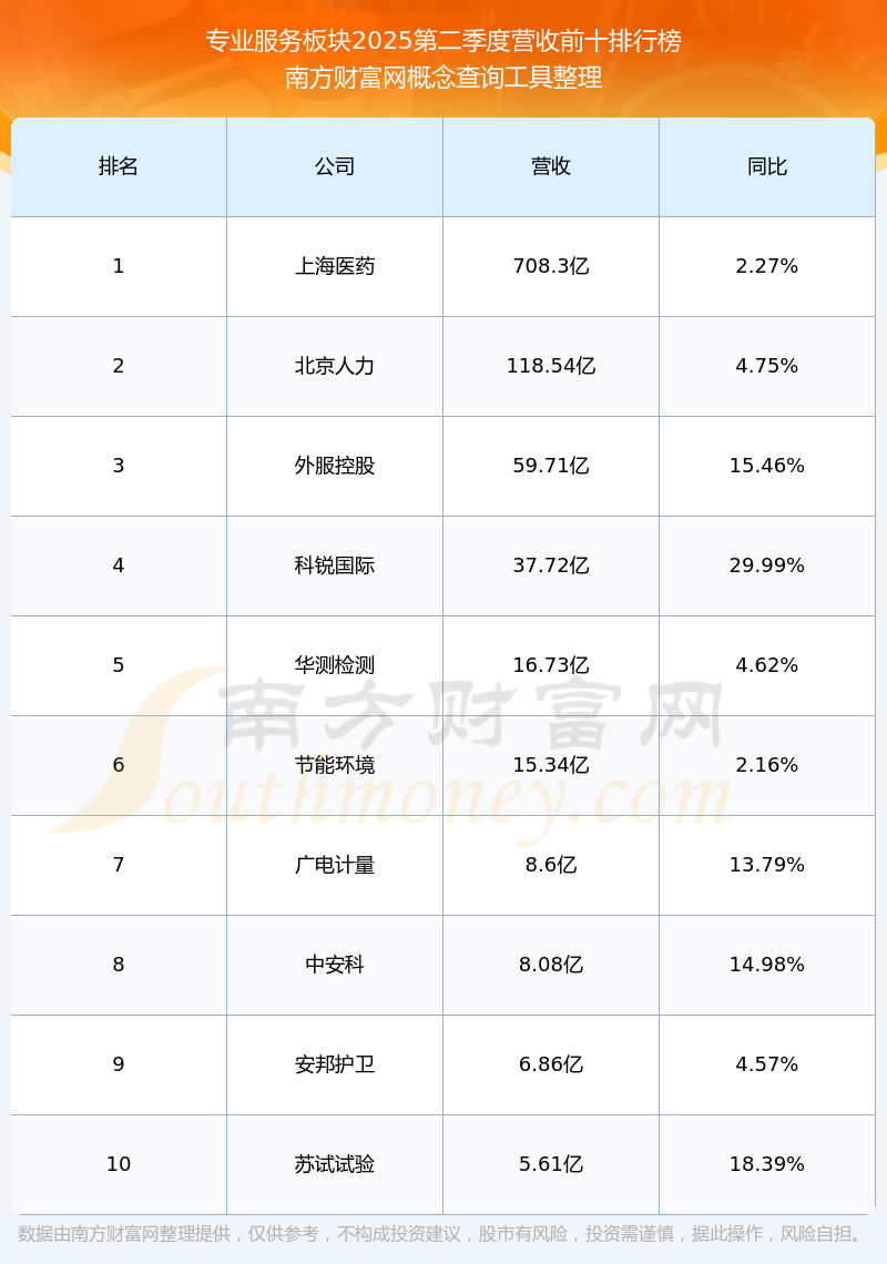 按照南方財富網(wǎng)概念查詢工具統(tǒng)計,該股所屬板塊為專業(yè)服務板塊,該板塊共有37只股票,航天工程2025第二季度營收在該板塊中排名為第37名,該板塊2025第二季度營收排名前十的股票如下表: