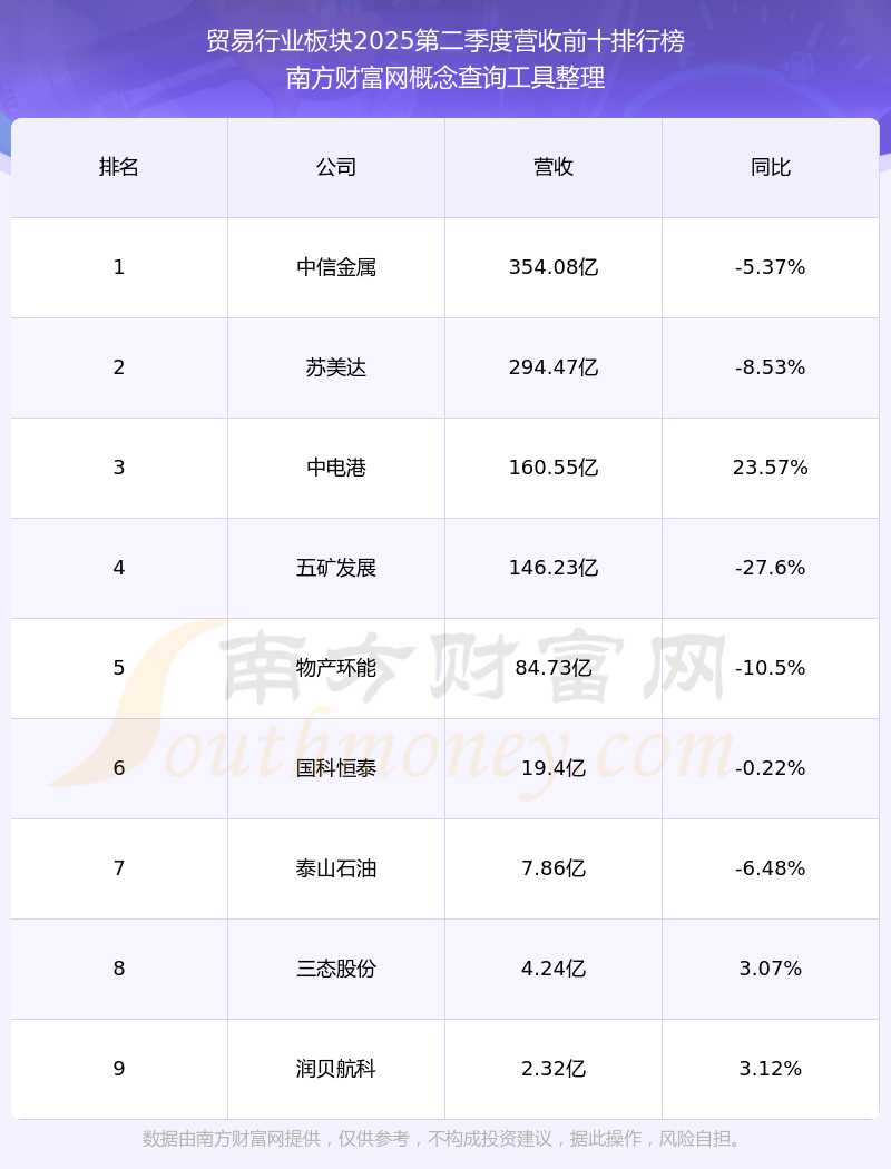按照南方財(cái)富網(wǎng)概念查詢工具統(tǒng)計(jì),該股所屬板塊為貿(mào)易行業(yè)板塊,該板塊共有9只股票,蘭生股份2025第二季度營收在該板塊中排名為第9名,該板塊2025第二季度營收排名前十的股票如下表: