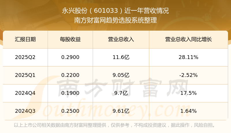 在2025年第二季度,永興股份的業(yè)績表現(xiàn),主營業(yè)務(wù)收入達到11.6億元,實現(xiàn)了28.11%的同比增長率。同時,公司歸母凈利潤錄得2.65億元,同比增長21.17%。