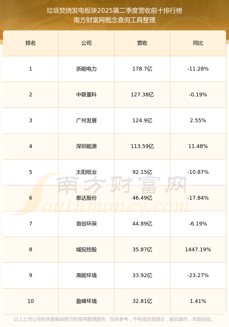 按照南方財富網(wǎng)概念查詢工具統(tǒng)計,該股所屬板塊為垃圾焚燒發(fā)電板塊,該板塊共有52只股票,永興股份2025第二季度營收在該板塊中排名為第26名,該板塊2025第二季度營收排名前十的股票如下表: