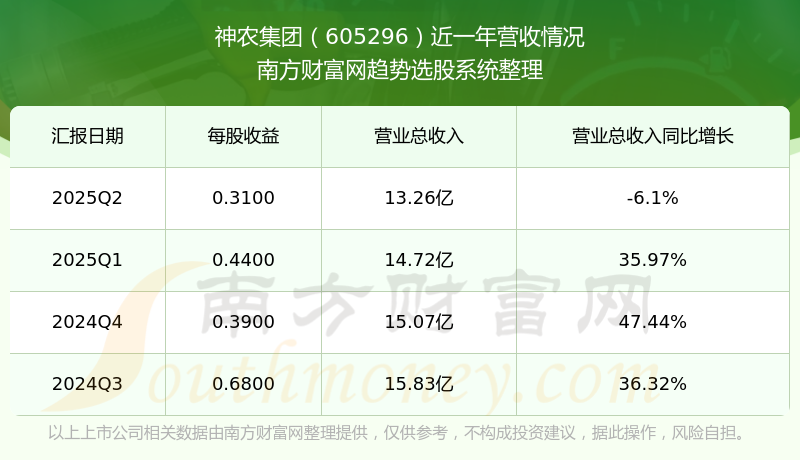 于2025年第二季度,神農(nóng)集團披露了其業(yè)績表現(xiàn),其中主營業(yè)務(wù)收入13.26億元,相較于去年同期-6.1%。此外,公司歸屬于母公司的凈利潤為1.59億元,同比增長了24.63%。在扣除所有非經(jīng)常性損益后,凈利潤1.69億元,同比增長28.96%。