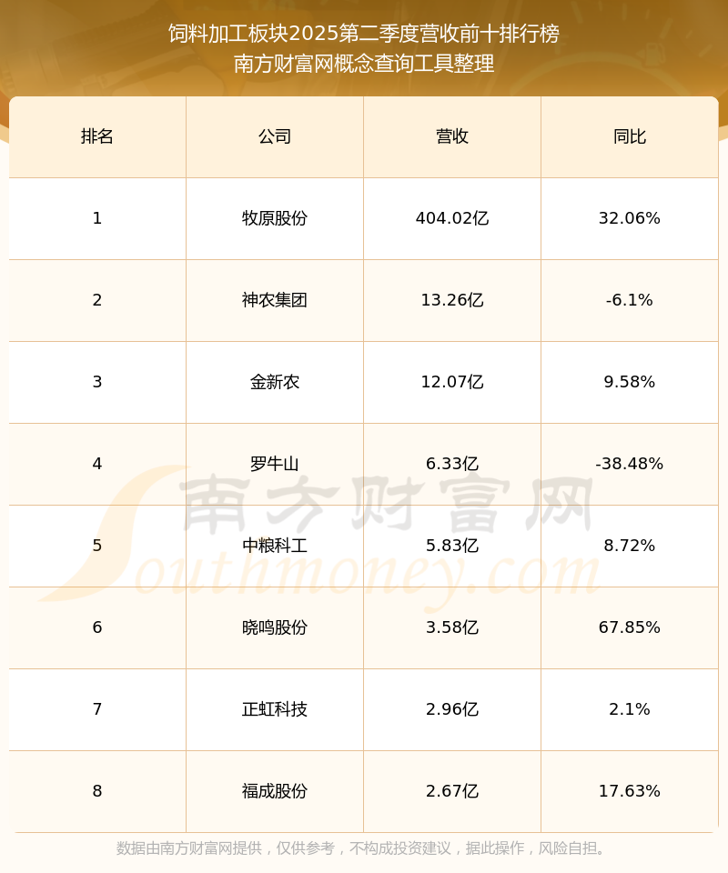 按照南方財富網(wǎng)概念查詢工具統(tǒng)計,該股所屬板塊為飼料加工板塊,該板塊共有8只股票,神農(nóng)集團2025第二季度營收在該板塊中排名為第2名,該板塊2025第二季度營收排名前十的股票如下表:
