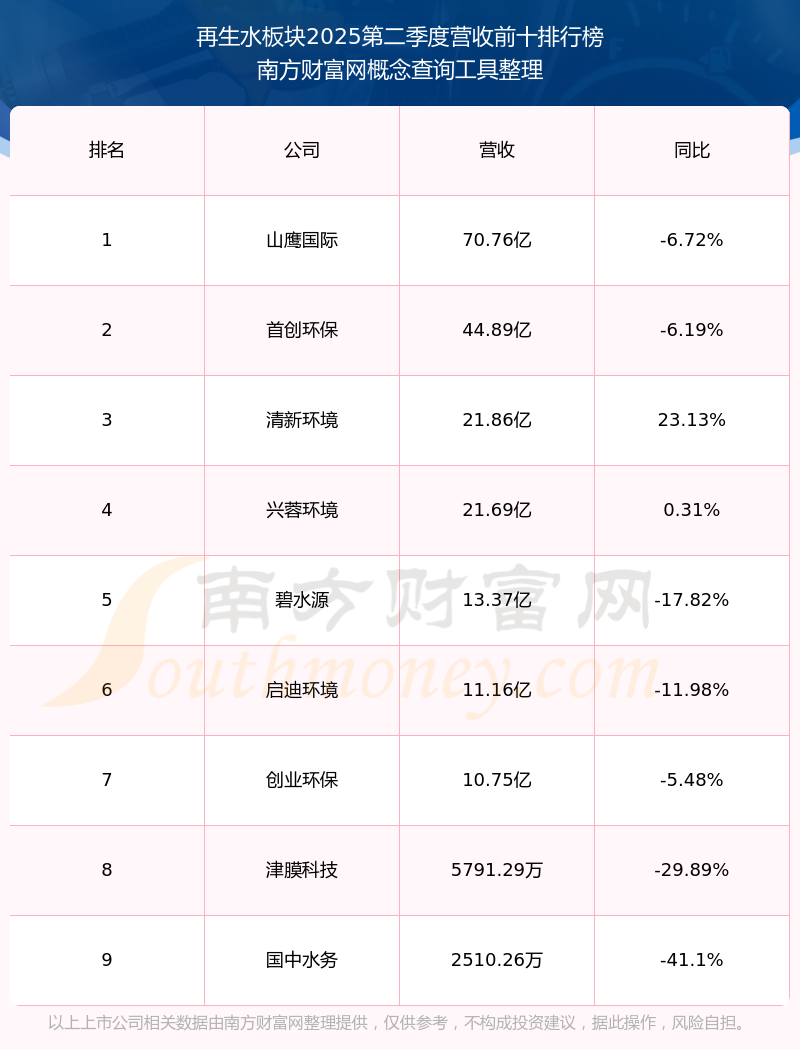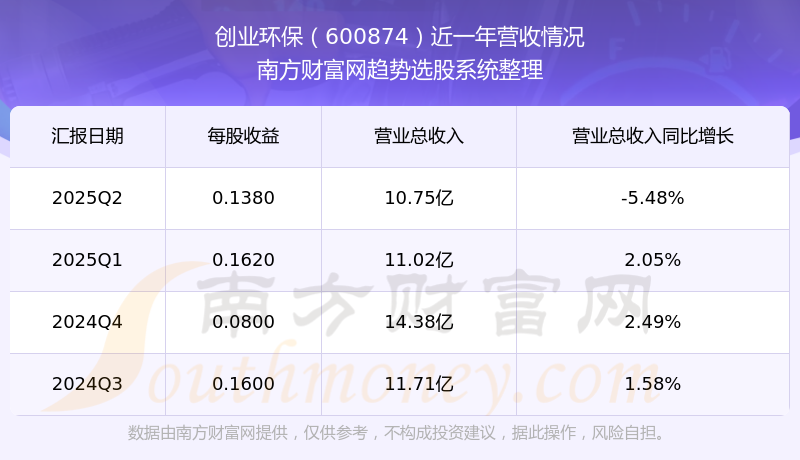 按照南方財富網(wǎng)概念查詢工具統(tǒng)計,該股所屬板塊為再生水板塊,該板塊共有9只股票,創(chuàng)業(yè)環(huán)保2025第二季度營收在該板塊中排名為第7名,該板塊2025第二季度營收排名前十的股票如下表: