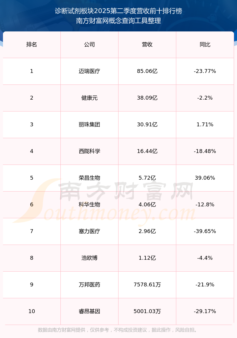 按照南方財富網(wǎng)概念查詢工具統(tǒng)計,該股所屬板塊為診斷試劑板塊,該板塊共有11只股票,健康元2025第二季度營收在該板塊中排名為第2名,該板塊2025第二季度營收排名前十的股票如下表: