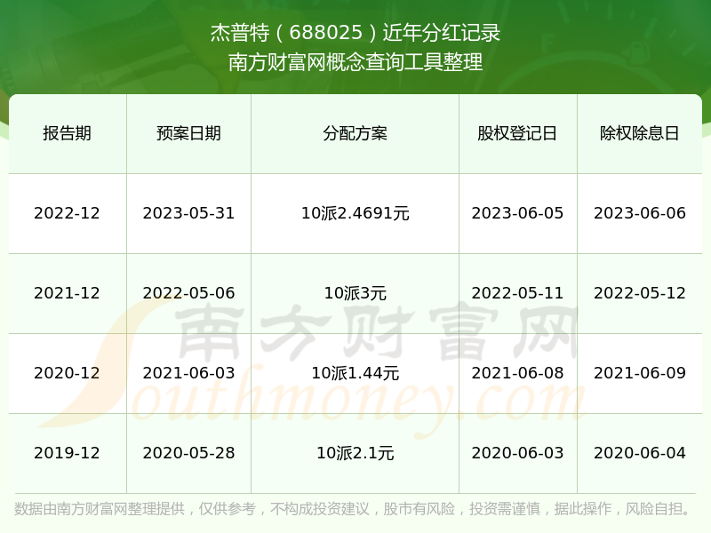 杰普特最新一次公布的分紅方案為10派2.4691元。本次權(quán)益分派股權(quán)登記日為2023年6月5日,除權(quán)除息日為2023年6月6日,派息日為2023年6月6日。