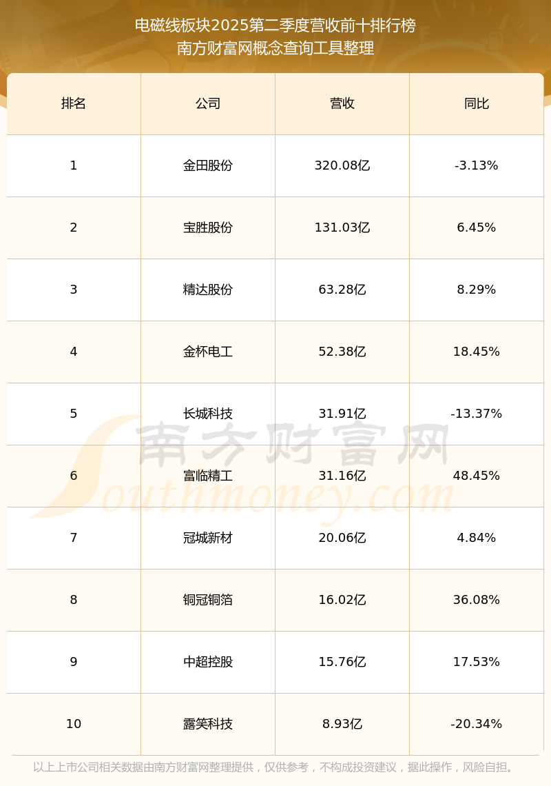 按照南方財(cái)富網(wǎng)概念查詢工具統(tǒng)計(jì),該股所屬板塊為電磁線板塊,該板塊共有20只股票,長城科技2025第二季度營收在該板塊中排名為第5名,該板塊2025第二季度營收排名前十的股票如下表: