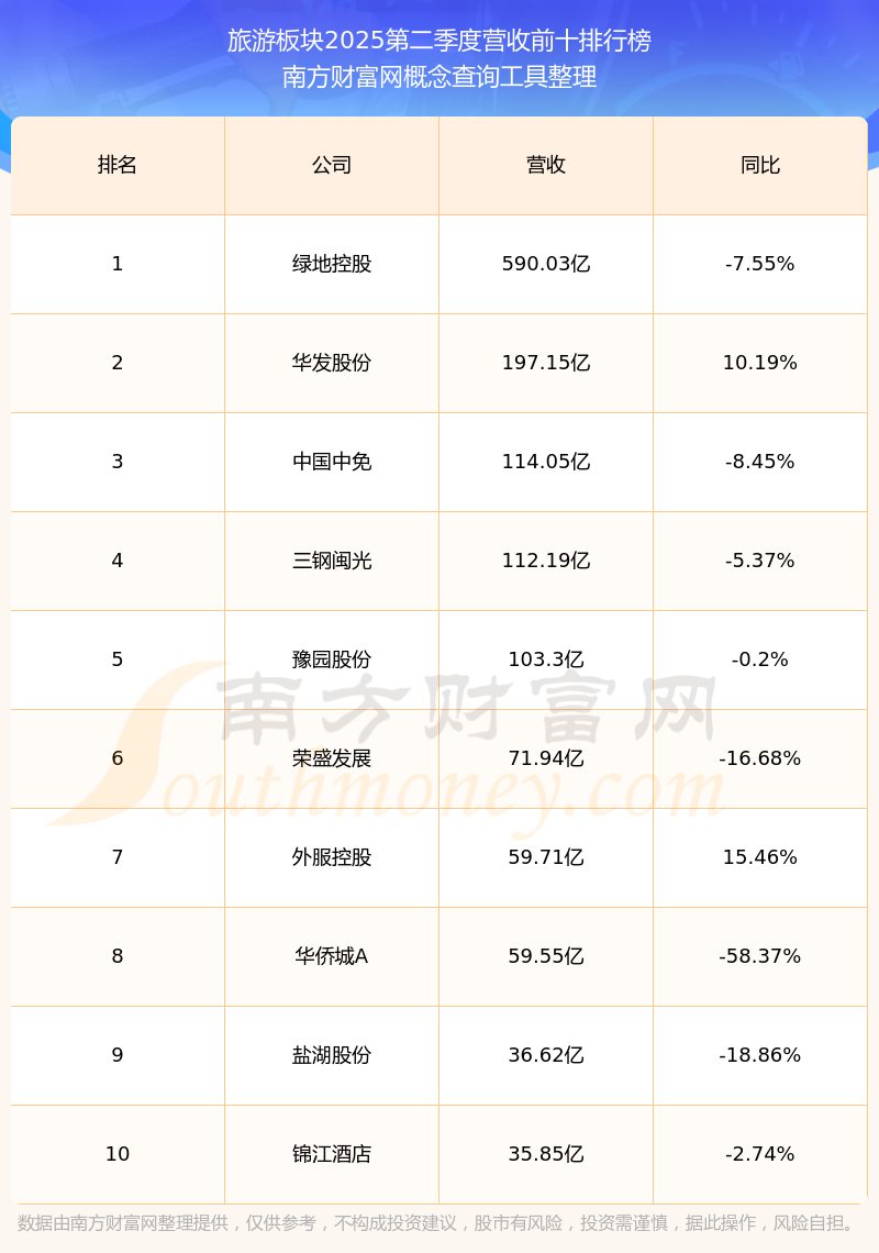 按照南方財(cái)富網(wǎng)概念查詢工具統(tǒng)計(jì),該股所屬板塊為旅游板塊,該板塊共有152只股票,西藏旅游2025第二季度營(yíng)收在該板塊中排名為第143名,該板塊2025第二季度營(yíng)收排名前十的股票如下表: