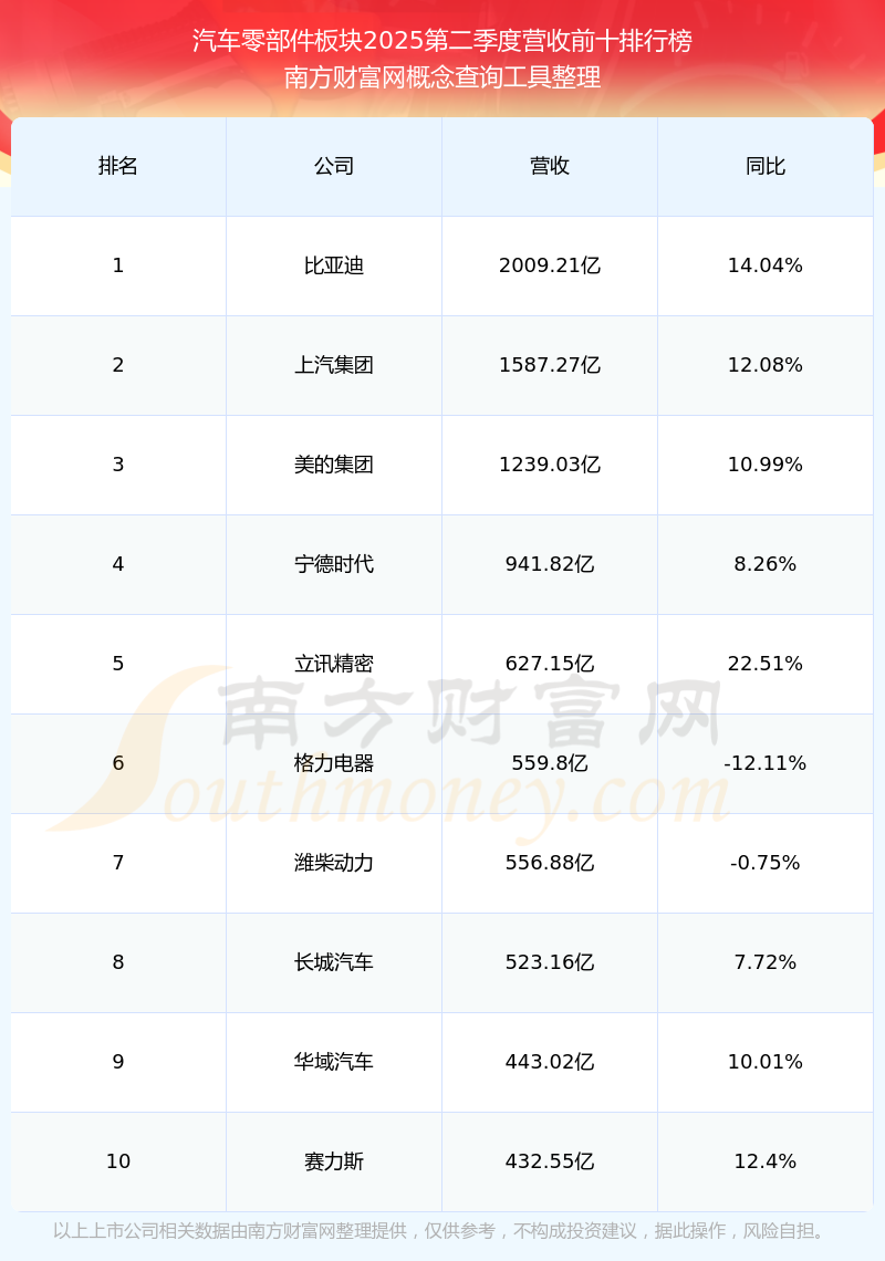 按照南方財(cái)富網(wǎng)概念查詢工具統(tǒng)計(jì),該股所屬板塊為汽車零部件板塊,該板塊共有567只股票,拓普集團(tuán)2025第二季度營(yíng)收在該板塊中排名為第39名,該板塊2025第二季度營(yíng)收排名前十的股票如下表: