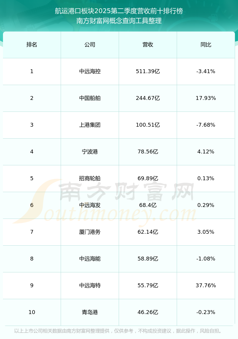 按照南方財(cái)富網(wǎng)概念查詢工具統(tǒng)計(jì),該股所屬板塊為航運(yùn)港口板塊,該板塊共有41只股票,日照港2025第二季度營(yíng)收在該板塊中排名為第18名,該板塊2025第二季度營(yíng)收排名前十的股票如下表: