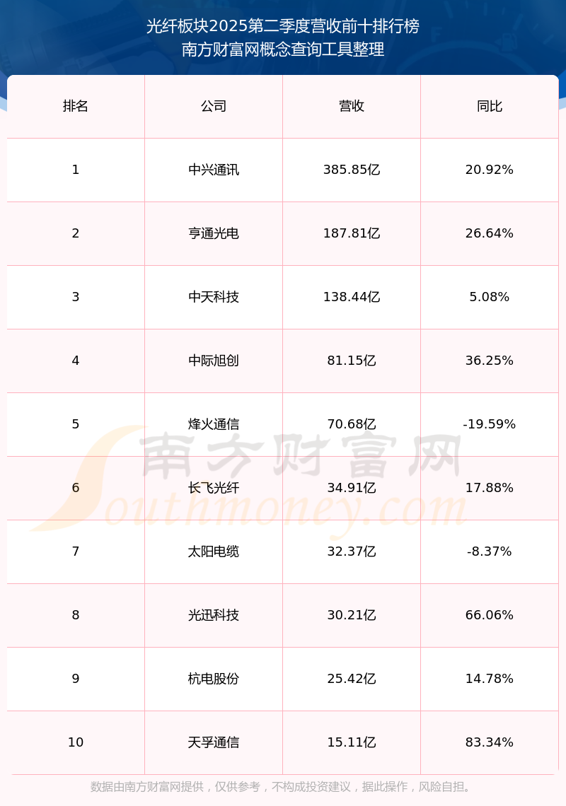 按照南方財(cái)富網(wǎng)概念查詢工具統(tǒng)計(jì),該股所屬板塊為光纖板塊,該板塊共有38只股票,烽火通信2025第二季度營(yíng)收在該板塊中排名為第5名,該板塊2025第二季度營(yíng)收排名前十的股票如下表:
