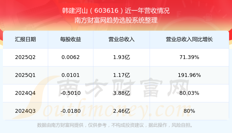 A股上市公司韓建河山(代碼:603616)發(fā)布2025年第二季度財報,公司2025年第二季度歸屬于上市公司股東的凈利潤為252.05萬元,凈利潤同比增長111.22%,環(huán)比增長-34.63%。
