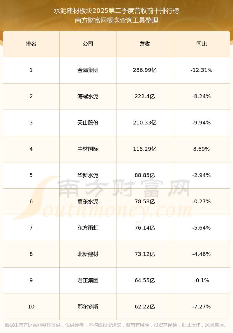 按照南方財富網(wǎng)概念查詢工具統(tǒng)計,該股所屬板塊為水泥建材板塊,該板塊共有48只股票,韓建河山2025第二季度營收在該板塊中排名為第42名,該板塊2025第二季度營收排名前十的股票如下表:
