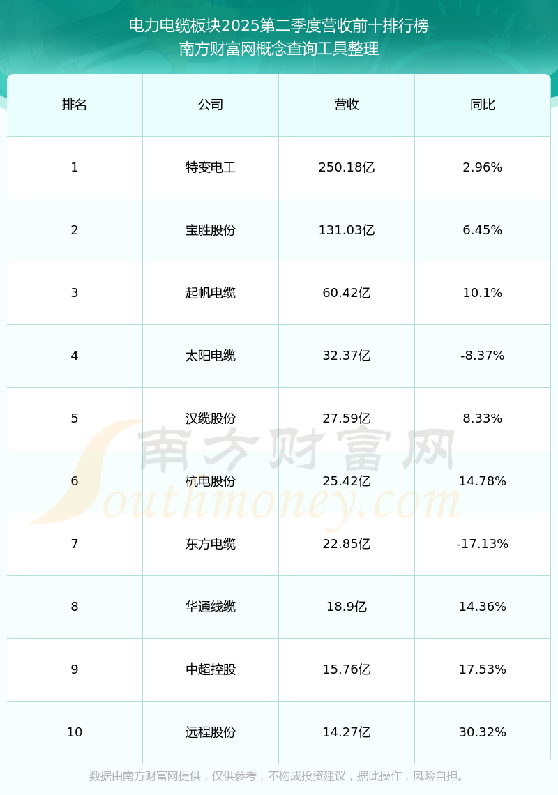 按照南方財(cái)富網(wǎng)概念查詢工具統(tǒng)計(jì),該股所屬板塊為電力電纜板塊,該板塊共有19只股票,起帆電纜2025第二季度營(yíng)收在該板塊中排名為第3名,該板塊2025第二季度營(yíng)收排名前十的股票如下表: