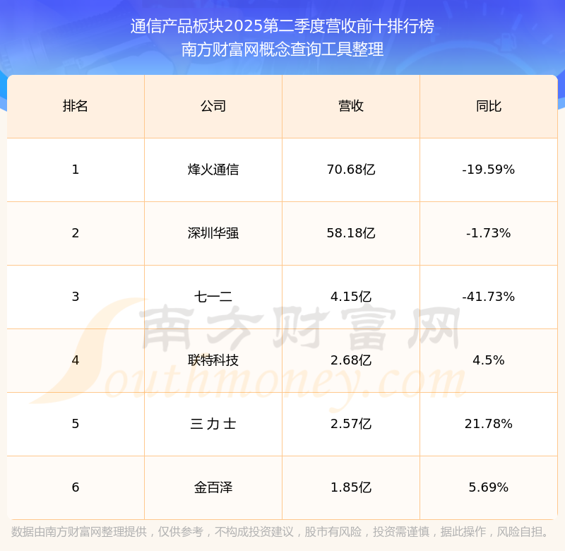 按照南方財富網(wǎng)概念查詢工具統(tǒng)計,該股所屬板塊為通信產(chǎn)品板塊,該板塊共有6只股票,映翰通2025第二季度營收在該板塊中排名為第6名,該板塊2025第二季度營收排名前十的股票如下表: