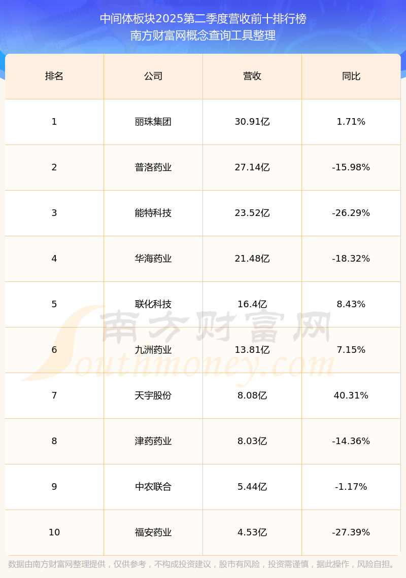 按照南方財(cái)富網(wǎng)概念查詢工具統(tǒng)計(jì),該股所屬板塊為中間體板塊,該板塊共有28只股票,嘉必優(yōu)2025第二季度營收在該板塊中排名為第28名,該板塊2025第二季度營收排名前十的股票如下表:
