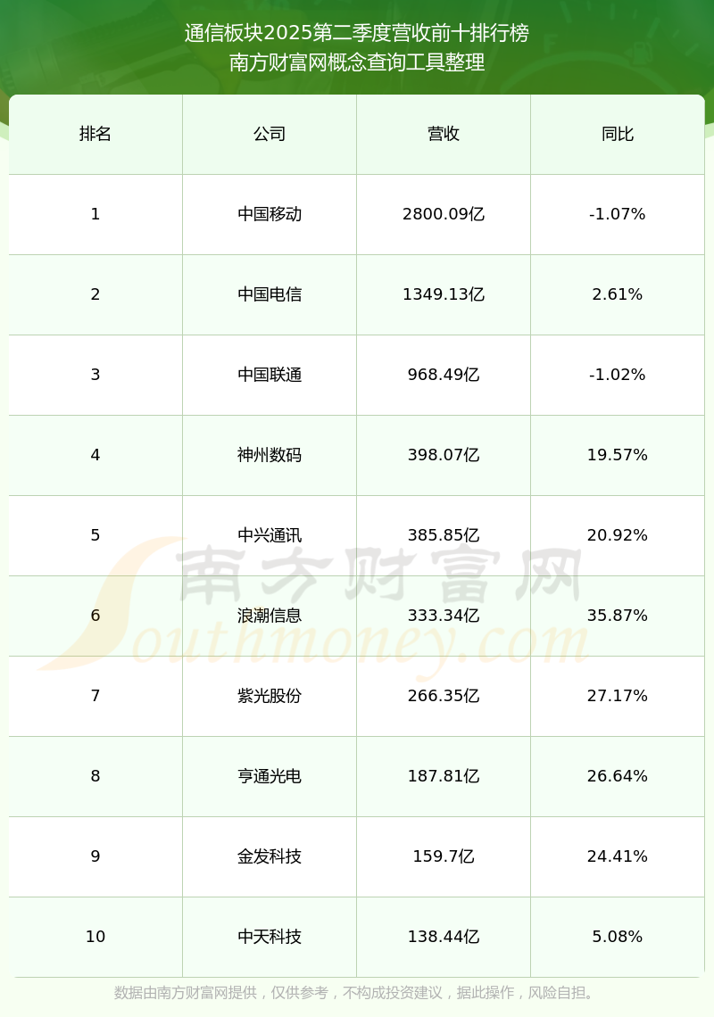 按照南方財(cái)富網(wǎng)概念查詢工具統(tǒng)計(jì),該股所屬板塊為通信板塊,該板塊共有206只股票,康希通信2025第二季度營(yíng)收在該板塊中排名為第206名,該板塊2025第二季度營(yíng)收排名前十的股票如下表: