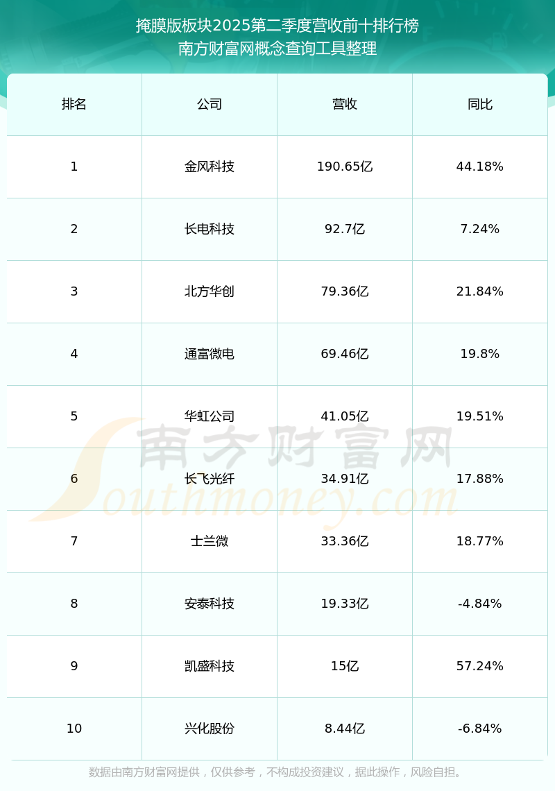 按照南方財富網(wǎng)概念查詢工具統(tǒng)計,該股所屬板塊為掩膜版板塊,該板塊共有26只股票,路維光電2025第二季度營收在該板塊中排名為第19名,該板塊2025第二季度營收排名前十的股票如下表:
