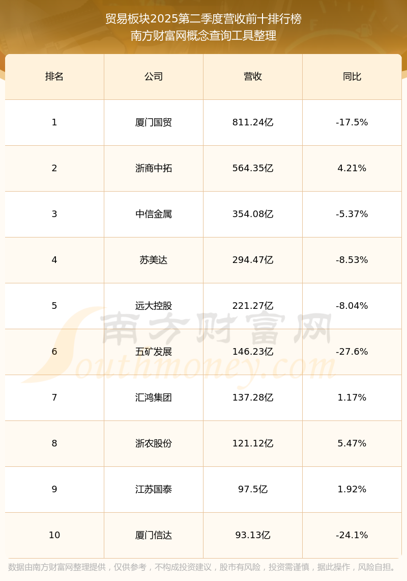 按照南方財富網(wǎng)概念查詢工具統(tǒng)計,該股所屬板塊為貿(mào)易板塊,該板塊共有37只股票,海南椰島2025第二季度營收在該板塊中排名為第37名,該板塊2025第二季度營收排名前十的股票如下表: