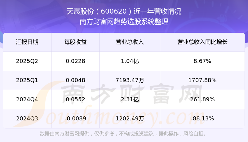 2025年第二季度,天宸股份營收同比8.67%,凈利潤同比-30.24%。