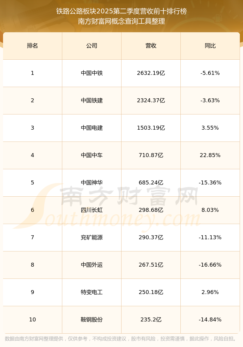 按照南方財富網(wǎng)概念查詢工具統(tǒng)計,該股所屬板塊為鐵路公路板塊,該板塊共有120只股票,天宸股份2025第二季度營收在該板塊中排名為第120名,該板塊2025第二季度營收排名前十的股票如下表: