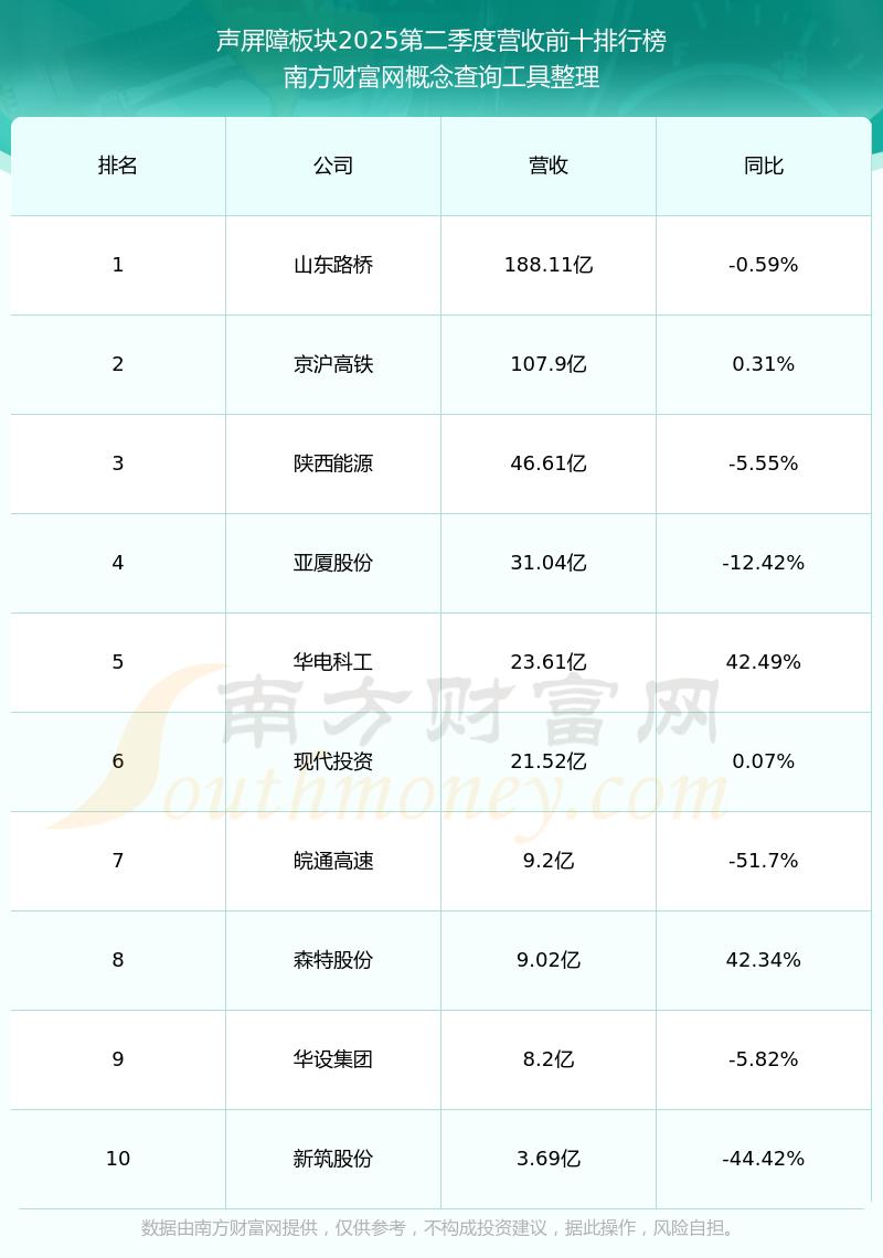 按照南方財(cái)富網(wǎng)概念查詢工具統(tǒng)計(jì),該股所屬板塊為聲屏障板塊,該板塊共有14只股票,九州一軌2025第二季度營(yíng)收在該板塊中排名為第14名,該板塊2025第二季度營(yíng)收排名前十的股票如下表:
