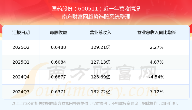 國藥股份2025年第二季度顯示,公司主營收入129.21億元,同比2.27%;歸母凈利潤4.9億元,同比-9.52%;扣非凈利潤4.85億元,同比-10.98%;